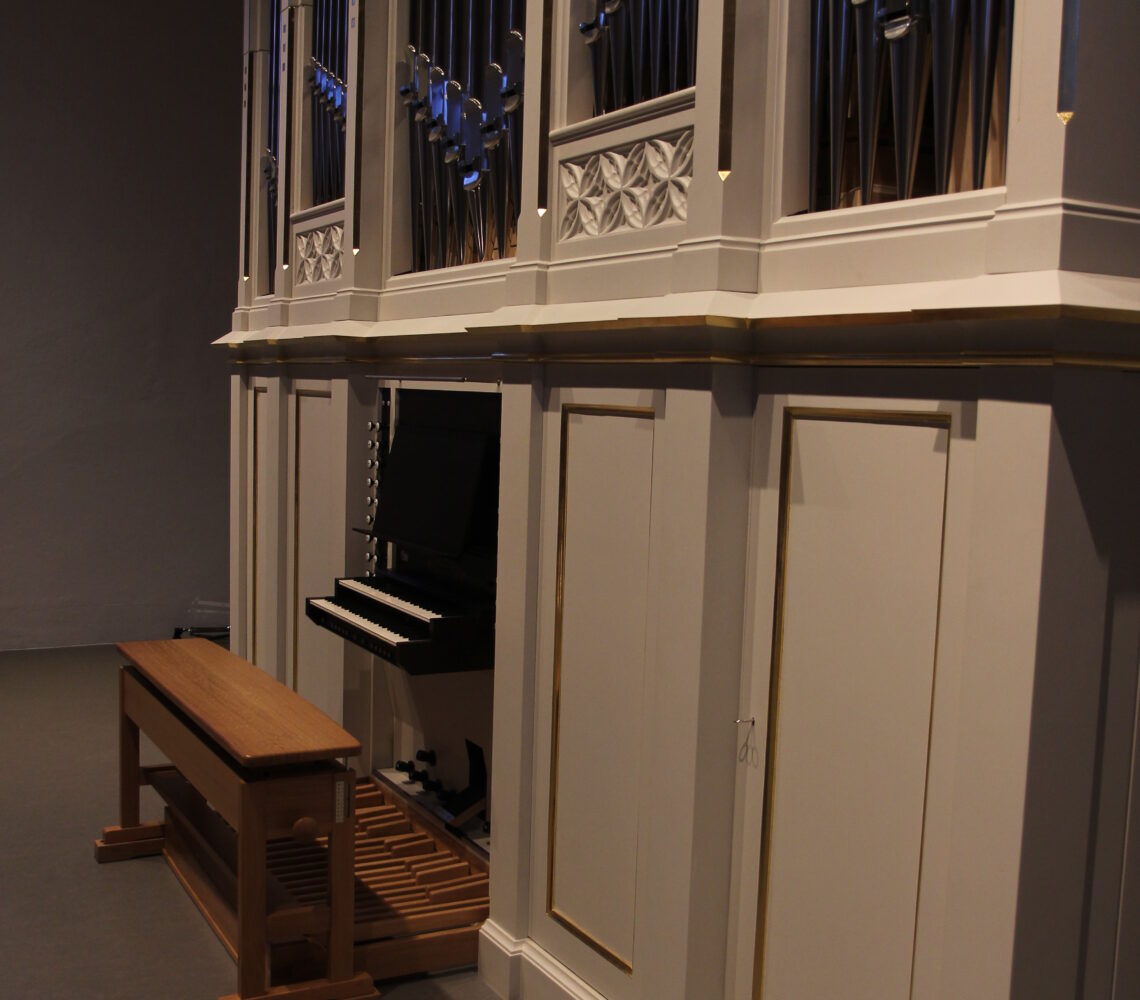 Der innere Aufbau der Orgel musste zum Einen den begrenzten Platz optimal ausnutzen, zum Anderen eine gute Klangentfaltung aller Pfeifen gewährleisten – und natürlich auch eine gute Zugänglichkeit zum Stimmen und Warten. Im Inneren ist die Orgel in zwei Höhenebenen unterteilt. Im Untergehäuse hinter dem Spieltisch folgt die mechanische Spielanlage der Orgel: Abstrakten (Zugdrähte), Wellen und Winkel stellen die Verbindung zwischen den Tasten und den Luftventilen in der Orgel her. Sie sind bis zu 5 Meter lang. Absolute Präzisionsarbeit unseres Konstrukteurs und der Orgelbautechniker ist nötig, damit alles präzise und leichtgängig funktioniert – immerhin muss man auch mit dem kleinen Finger die gesamte Mechanik in Bewegung setzen können. Viele Tausend Einzelteile sind hier eingebaut – wohlgeordnet und gegliedert. Laufböden ermöglichen den Zugang für Wartungen und Regulierungen.